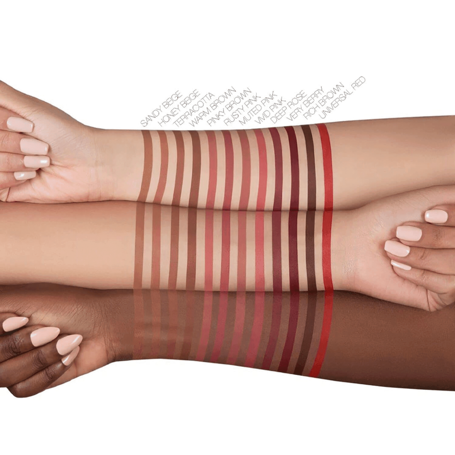 Sandy peige ,Honey peige ,Terracotta ,Warm brown ,Pinky brown ,Rusty pink ,Muted pink ,Vivid pink ,Very berry ,Deep Rose ,Rich brown ,Universal Red |